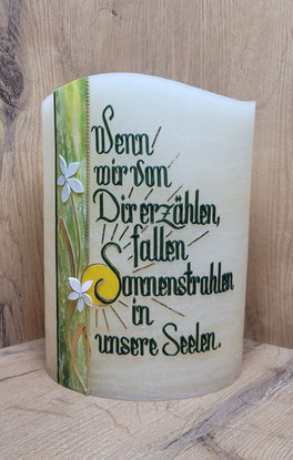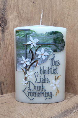 In den schweren Zeiten des Abschieds, ist eine besondere Trauerkerze zur Beerdigung, verziert mit einem schönen Spruch oder Muster, mit ihrem Licht tröstend. Jede Verabschiedung ist ganz individuell die passende Kerze kannst du bei mir oder in verschiedenen Geschäften kaufen.